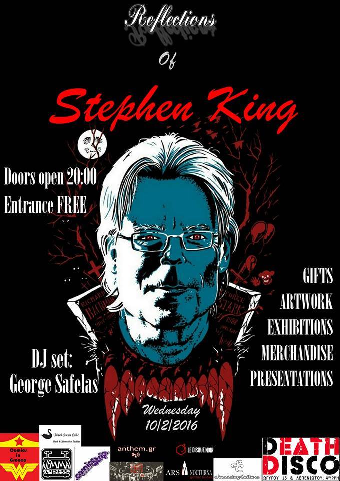 Το αφιέρωμα της των Reflections της Death Disco στους 3 μεγάλους δημιουργούς του τρόμου και του Φανταστικού έκλεισε την Τετάρτη που μας πέρασε (10/2) με μια βραδιά στον μεγαλύτερο συγγραφέα που βρίσκεται ακόμα εν ζωή, τον Steven King! Στον φιλόξενο χώρο της Death Disco, με τις γνώριμες και δυναμικέ μουσικές επιλογές του Γιώργου Σαφέλα, μας δόθηκε η ευκαιρία να δούμε έργα νέων καλλιτεχνών που επηρέαστηκαν από τον μεγάλο Αμερικανό συγγραφέα, να ακούσουμε ιστορίες που αν τις άκουγε αυτός θα αισθανόταν περήφανος το λιγότερο, αλλά και να κάνουμε μια απόπειρα να χαρτογραφήσουμε, αν όχι την αδάμαστη βιβλιογραφία του, τουλάχιστον τα θέματα με τα οποία ένας τόσος πολύπλευρος συγγραφέας έχει καταπιαστεί.΄λκ