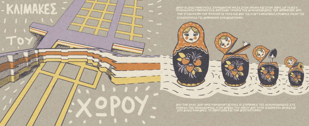 Η έννοια της κλίμακας είναι κομβική για το σχεδιασμό. Όπως χαρακτηριστικά αναφέρεται, «σκοπός του σχεδιασμού είναι να επιτρέψει να ξεδιπλωθούν διαφορετικές δραστηριότητες σε διαφορετικές κλίμακες. Από την άλλη δεν υπάρχει τίποτα αποκομμένο στη φύση. Οι διαφορετικές αυτές κλίμακες αποτελούν μία ενότητα» (Πλεύρης, 2025, σ. 68). Αυτή τη διαλεκτική σχέση πολύ εύστοχα την αποτυπώνει ο συμβολισμός της μπάμπουσκας στα σκίτσα του Αspalax, αλλά και η εξέλιξη της εικονογράφησης καθώς αυτή εξηγεί τα διάφορα επίπεδα του σχεδιασμού, η οποία επιτρέπει στον αναγνώστη να έχει άλλοτε ματιά που ζουμάρει σε επίπεδο γειτονιάς-κατοικίας και άλλοτε να μεταφέρεται επισκοπικά στο ευρύτερο αστικό πλαίσιο. H πολεοδομία έχει εξάλλου τον δύσκολο και βαρύ ρόλο να βρίσκεται σε μία ενδιάμεση κλίμακα: επηρεάζει από μια γειτονιά της πόλης μέχρι ένα ευρύτερο αστικό σύνολο. Αυτή ακριβώς η ενδιάμεση κλίμακα της δίνει και ένα ειδικό βάρος, θα λέγαμε, καθώς κάθε απόφαση σε αυτό το επίπεδο επιδρά με πολλαπλό τρόπο και αποφέρει οφέλη και επιπτώσεις που  θα πρέπει να αξιολογούνται ανά περίπτωση, τόσο σε επίπεδο επιμέρους κλίμακας όσο και ως προς τις αλληλεπιδράσεις που επιφέρουν εντός του ευρύτερου αστικού συνόλου.