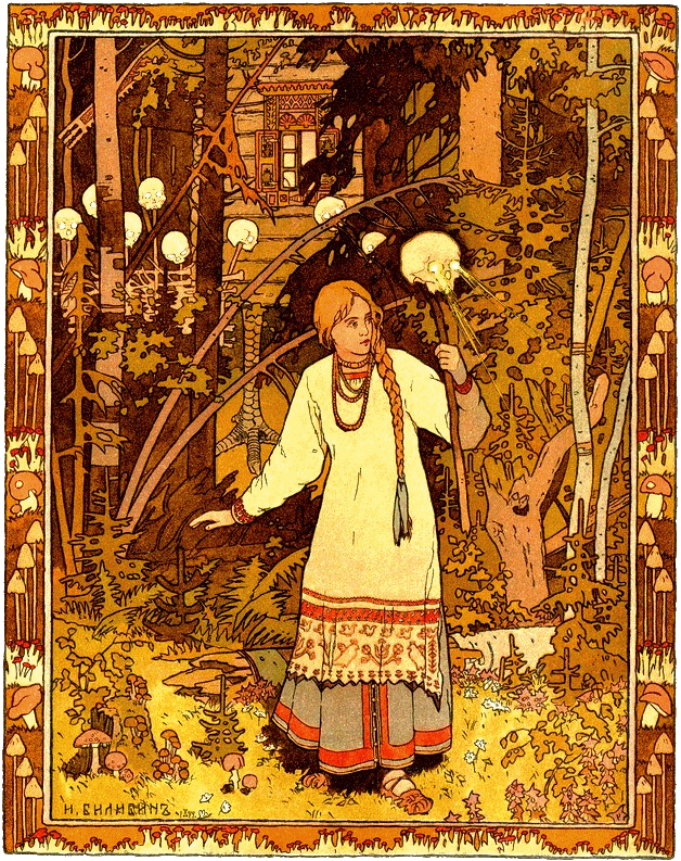 H Baba yaga είναι πνεύμα του δάσους και κυρά της μαγείας. Συναντάται όχι μόνο σε πολλά ρώσικα παραμύθια, τα οποία είναι και τα αγαπημένα μου, αλλά και, εν γένει, στην σλάβικη λαϊκή παράδοση, σαν ηλικιωμένη, κοκαλιάρα, ανθρωποφάγα μάγισσα, που πετάει στον αέρα μέσα σε ένα γουδί, χρησιμοποιώντας το γουδοχέρι σαν τιμόνι, ενώ σβήνει τα ίχνη πίσω της με μια σκούπα από ασημένια σημύδα.