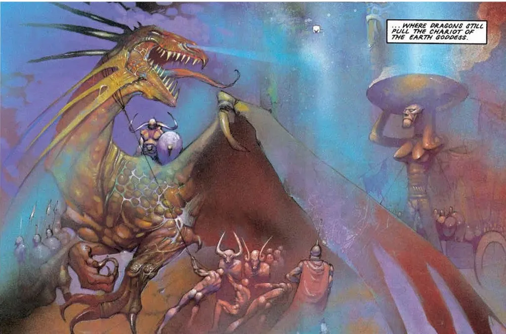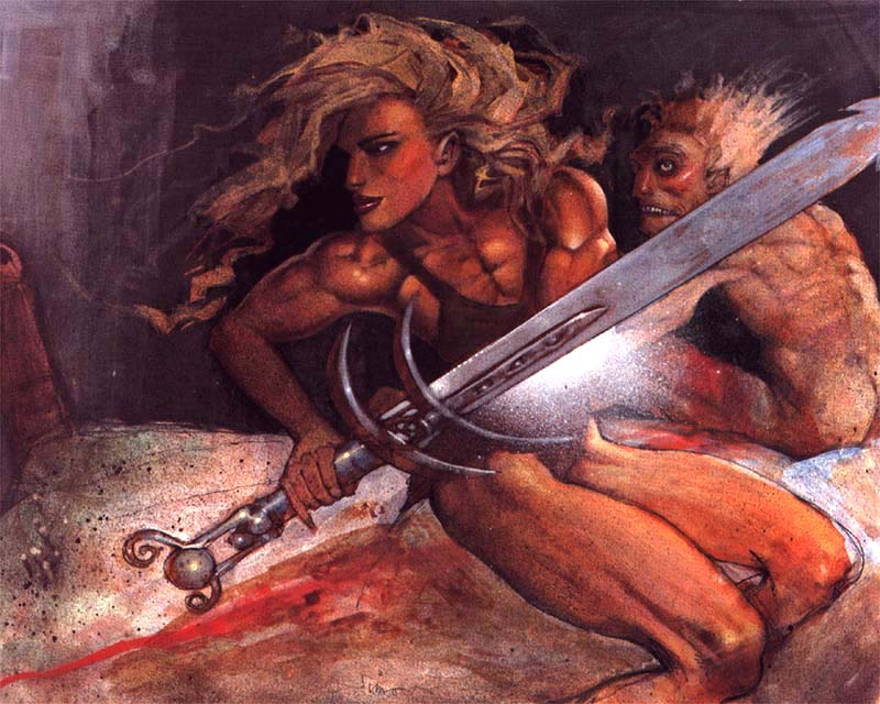 Το σχέδιο του Simon Bisley όχι απλά δε θα μπορούσε να παραληφθεί, αλλά αποτελεί και ένα από τα πλέον ισχυρά χαρτιά αυτού του τόμου. Σχέδια βαριά, φορτωμένα παραμυθικά, σουρεαλιστικά σκηνικά αναδύουν τη διττή αίσθηση ονείρου και εφιάλτη. Οι έντονα σκηνοθετημένες χορογραφίες βίαιων, αιματοβαμμένων μαχών παρασύρουν τον αναγνώστη με τον καταιγιστικό τους ρυθμό, οπτικό και σωματικά αφηγηματικό. Θα ήταν μια τρομερή παράλειψη ένα τέτοιο σχέδιο να μην συνοδεύεται από τη χαρακτηριστική χρωματική παλέτα του Bisley, ενός από τους σημαντικότερους fantasy artists της εποχής (αλλά και γενικά). Και φαίνεται ότι κάτι τέτοιο σκέφτηκαν και αρχικά στην 2000 ΑD, το κλασικό πλέον βρετανικό περιοδικό το οποίο εξέδιδε τότε το Slaine, παρόλο που καθώς η μία χρωματισμένη (λόγω κόστους) ιστορία κάθε τεύχους συνήθως ήταν του star της εταιρείας, του διάσημου Judge Dread. Ωστόσο ο Δικαστής έκανε για λίγο άκρη για τον Βάρβαρο και έτσι μπορούμε να χαρούμε έργα που άνετα έστεκαν και μόνα τους, ως πίνακες επηρεασμένους με, εφάμιλλους δε του Frank Frazetta. Όπως γίνεται κατανοητό, μιλάμε για μία κορυφαία epic fantasy εμπειρία