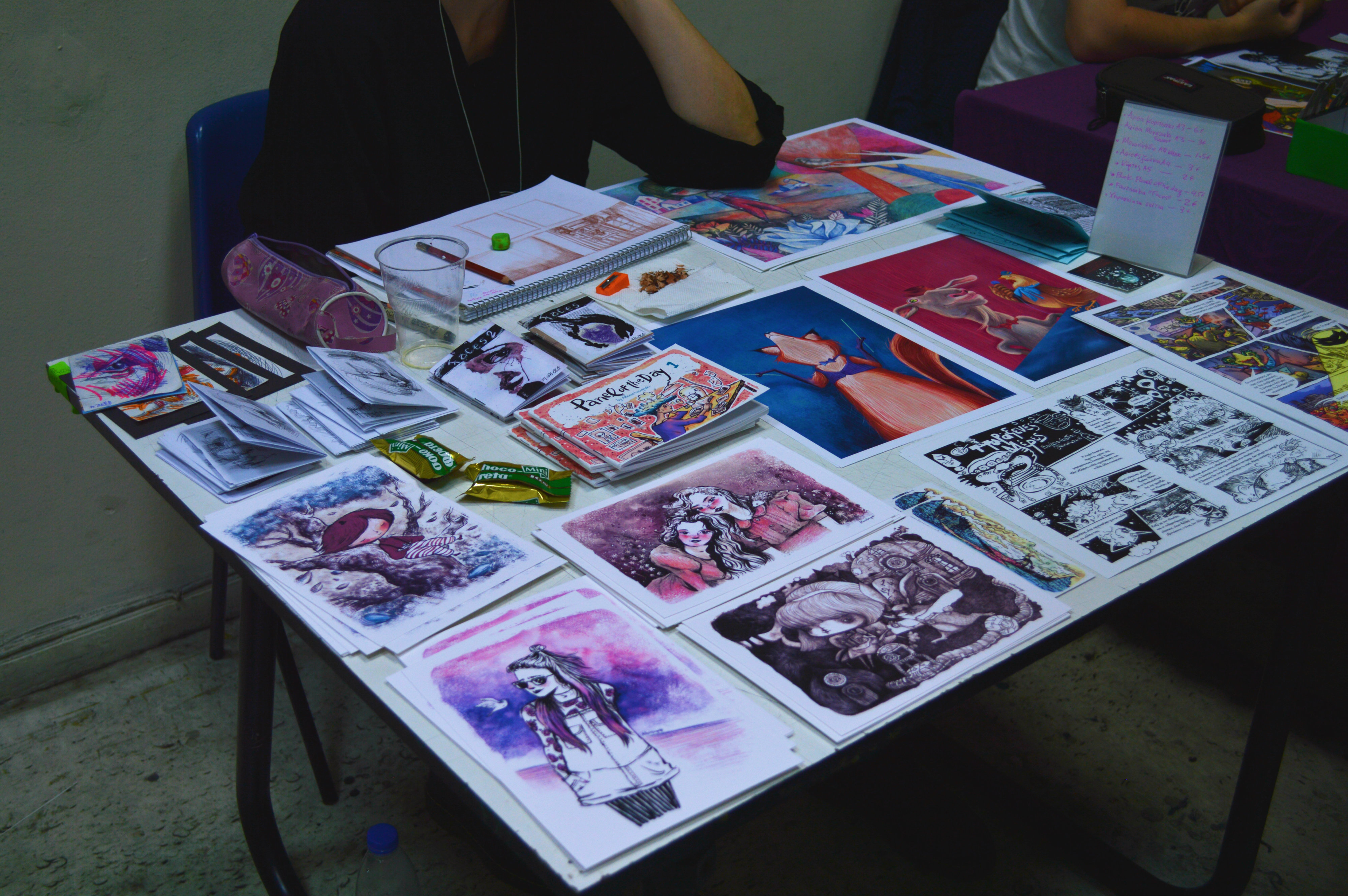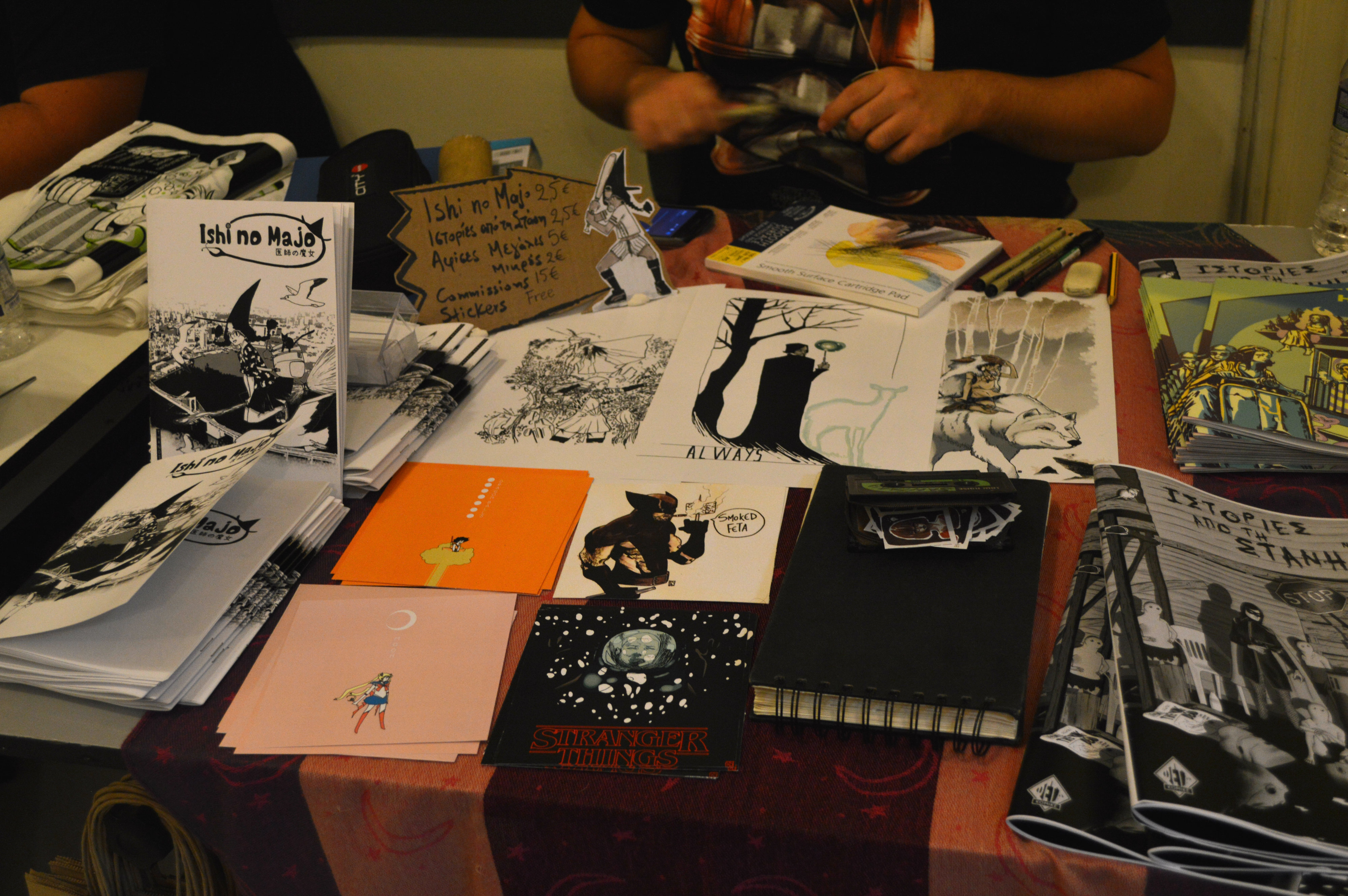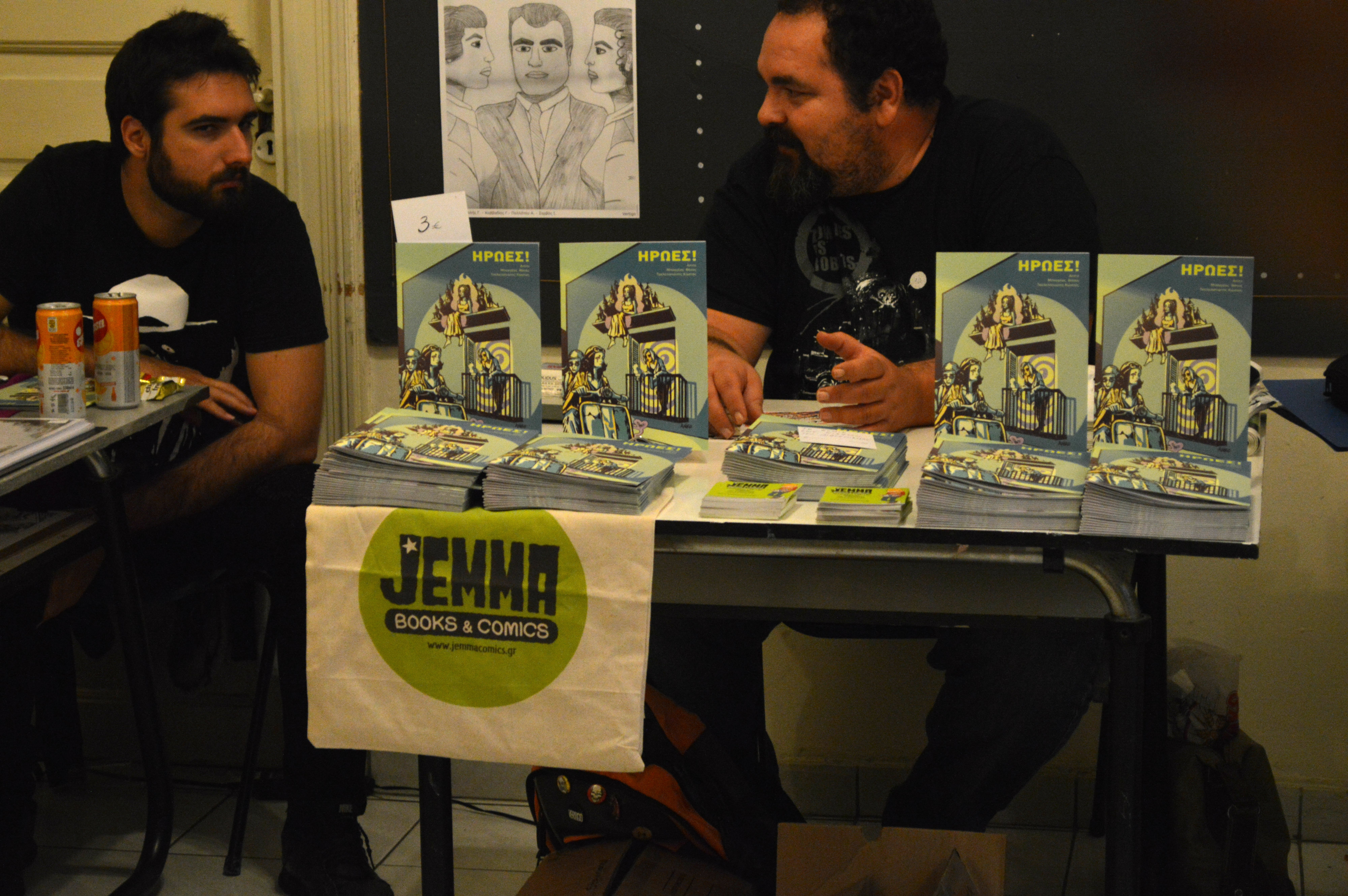 Μετά από έναν ανεπαίσθητο απόπροσανατολισμό, βρεθήκαμε στον πρώτο όροφο, όπου φιλοξενούνταν τα fanzines, οι αυτοεκδόσεις, αλλά και οι νικητές του διαγωνιμού “Ήρωες” της Jemma Press, όπου με χαρά είδαμε ανάμεσα τους την γνωστή Αniro! Οι υπόλοιποι νικητές του διαγωνισμού ήταν ο Θανάσης Παγνκέας και ο Aρης Λάμπος. Στον ίδιο όροφο βρήκαμε και άλλες γνώριμες φιγούρες, όπως τον Ανδρέα Μιχαηλίδη, τον Γιάννη Ρουμπούλια. αλλά και άλλους δημιουργούς που θα μας απασχολήσουν σίγουρα στο μέλλον! Να επισημάνουμε για άλλη μια φορά πως οι τιμές των έργων ήταν ιδιαίτερα χαμηλές, αναγνωριστικές σχεδόν, πράγμα για το οποίο αξίζει να δώσουμε συγχαρητήρια στους δημιουργούς, καθώς τα κόστη της αυτοέκδοσης στις μέρες μας είναι σχεδόν απαγορευτικά και το κέρδος πολλές φορές δεν είναι ούτε το αναμενόμενο ούτε ικανό να συντηρήσει έναν καλλιτέχνη.